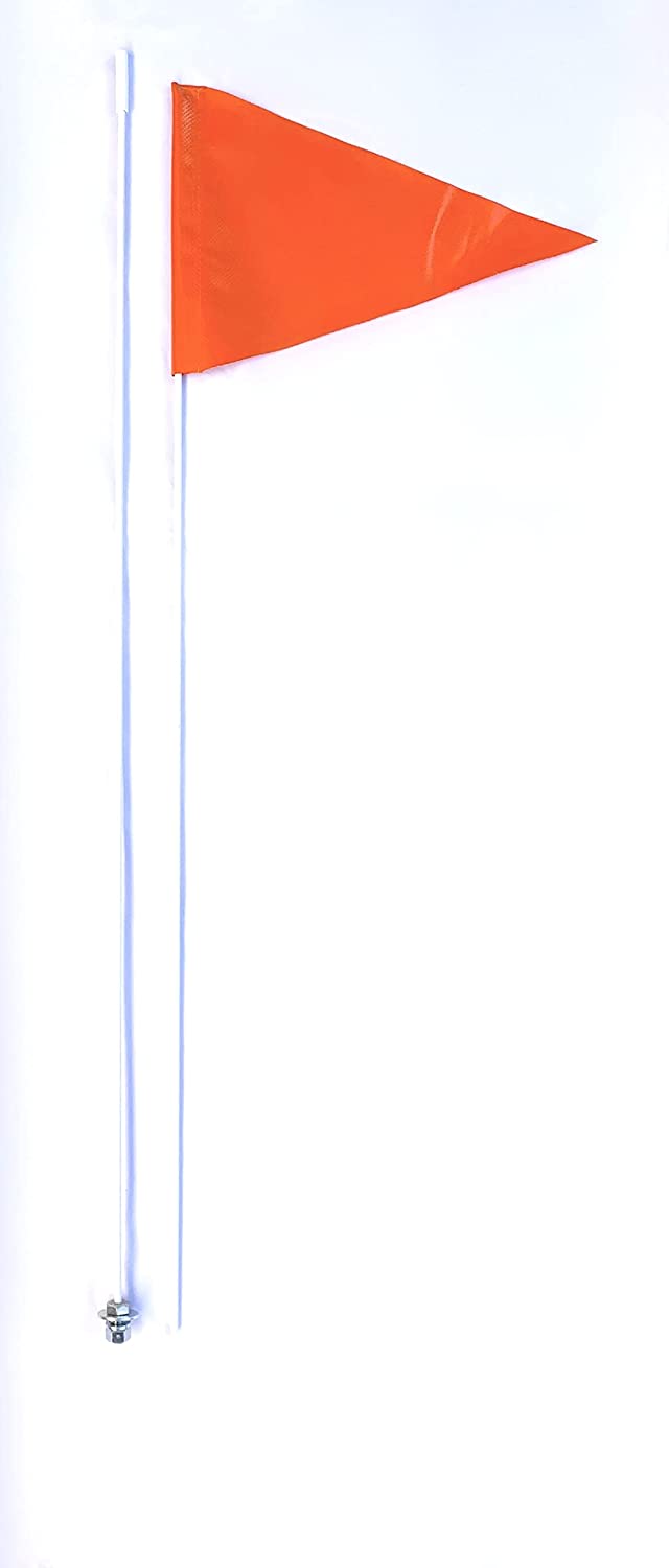 BANDERA PARA VEHÍCULOS TODO TERRENO DE 2 PARTES - 7 PIES Esta bandera consta de 2 secciones de fibra de vidrio de 42" unidas por un conector de nailon. Esta bandera para vehículos todo terreno de 7' viene con un banderín naranja de vinilo resistente al desgarro y a la decoloración en una varilla de fibra de vidrio de 1/4" con un conjunto de pernos de montaje