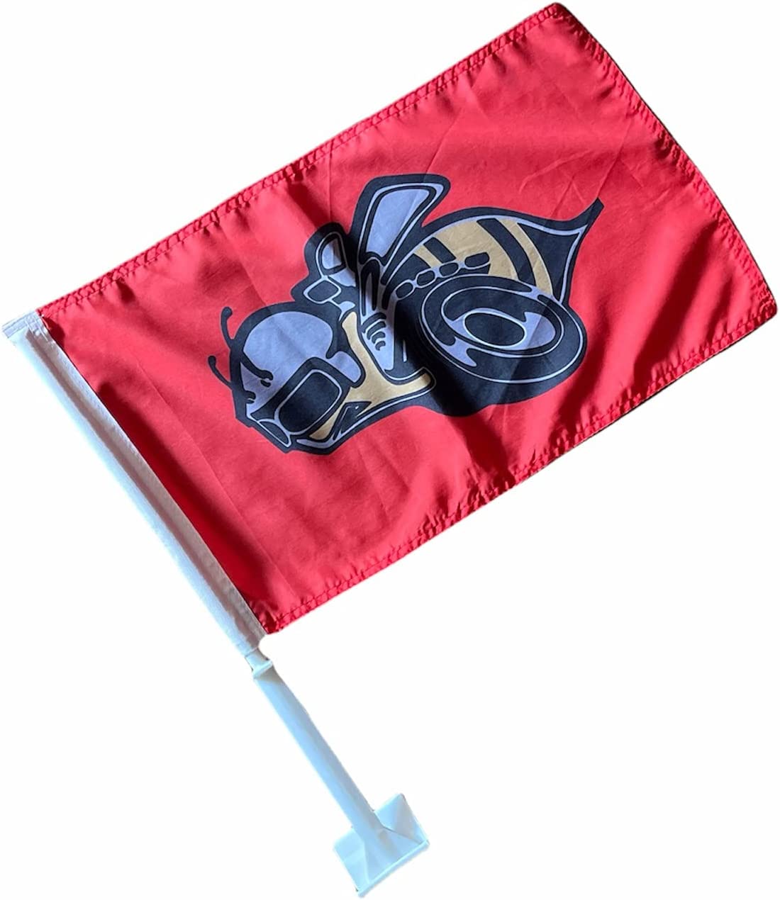 QTY: 1 Flag dimensions approx :12" H x 19" W Overall dimensions approx :17.5" H x 19" W Mounted to a one piece heavy duty white plastic staff with bracket Bracket includes a clip for easy mounting Made of fabric nylon material
